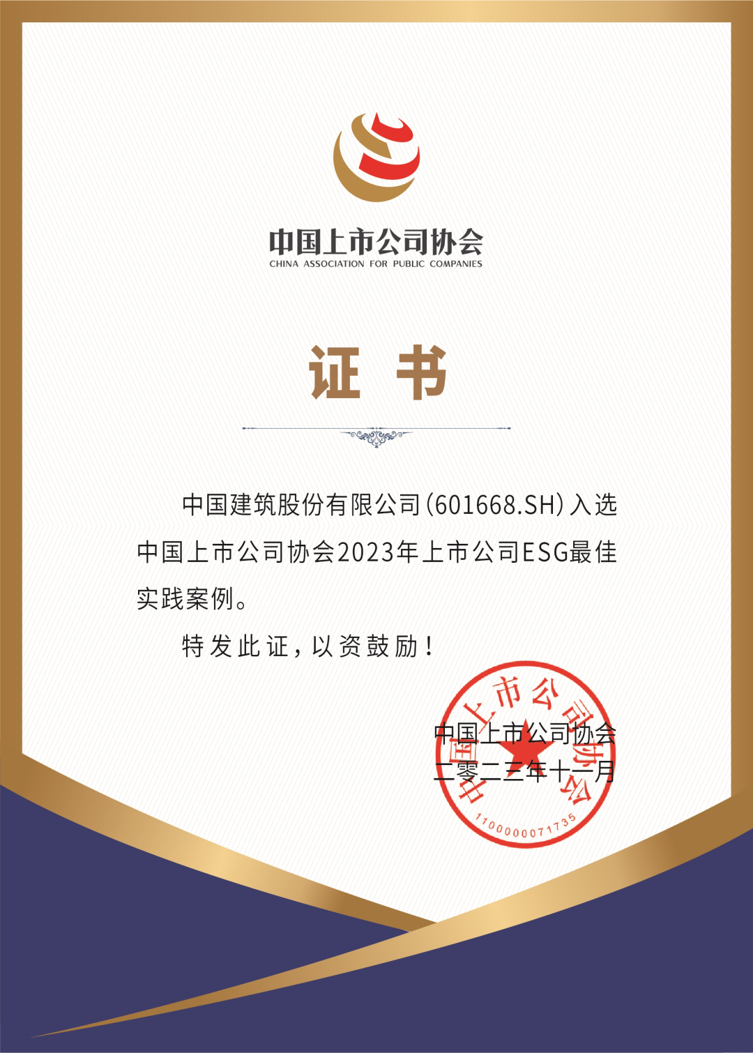 近日,由中国上市公司协会主办的首届中国上市公司可持续发展大会在京召开,现场发布了《中国上市公司ESG最佳实践案例2023》。中国建筑凭借优秀的ESG实践成果,荣获“2023年上市公司ESG最佳实践案例”。