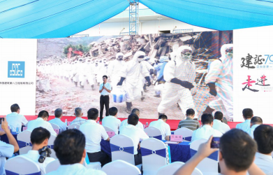 7 月 5日,中建八局“建证 70 年·迈向世界一流”主题宣讲宣传暨“走进·与祖国同行”系列活动在深圳中广核工程大厦项目举办。活动中,正式启动中建八局“移动党史馆巡回展”,来自深圳东江纵队纪念馆和山厦革命历史纪念馆的70余张党史展板、300余幅珍贵历史图片组成了一个移动党史馆,让红色党史走进工地一线。在“不忘初心、牢记使命”主题宣讲环节,八局一公司员工张继超回忆起 11 年前汶川抗震救灾中建人展现的铁军担当和大爱真情,在场观众无不为之动容。